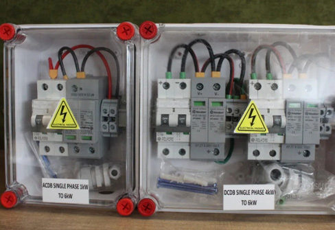 The ACDB is connected between the inverter and the load/grid. It distributes alternating current to various loads and includes essential safety features like MCBs, MCCBs, SPDs, and energy meters. It ensures controlled and protected power flow to appliances or the main grid.